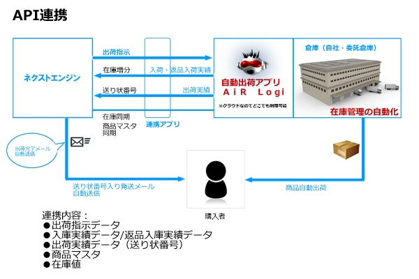 物流倉庫自動出荷・在庫管理アプリ「AiR Logi」とネクストエンジンを完全連携するアプリです。