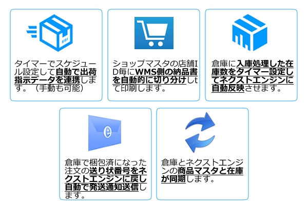 ネクストエンジンの「印刷待ち」注文を時間設定して自動的に貴社指定のEC物流倉庫から自動出荷します。