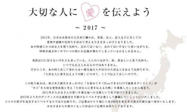 (株)リベルタ(本社:東京都渋谷区、代表取締役:佐藤透)は、2017年2月10日(金)から4月16日(日)まで、東日本大震災の復興支援として、「愛」や「感謝」に纏わる「大切な人に愛を伝えよう川柳」の募集を行います。皆さまの想いを被災地への支援という形で届けると共に、ご応募1件につき100円を被災地へと寄付します。