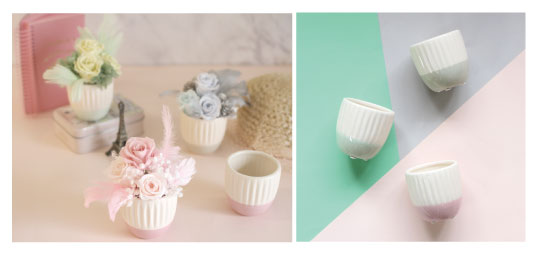 ふんわりとした優しい色合いが場を和ませる、3色のパステルカラーのポットが新登場。カラーは全部で3色。女性に人気のペールピンク、優しい配色のミルキーグリーン、大人な演出にぴったりのシャビーグレー。トップには幾何学模様が彫り込まれており、可愛いカラーにちょっぴりスタイリッシュなスパイスを加えてあります。淡いパステルカラーには安心感や安らぎを与える効果がある為、ベッドルームやリビングなどリラックスしたい場所にも適した佇まいです。普段使いのお花のアレンジはもちろんのこと、お見舞いや、ギフトなどにもおすすめの商品です。