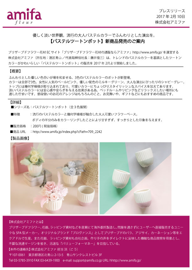 プリザーブドフラワー、花器、ラッピング資材などを直貿にて海外委託製造し、問屋を通さずにユーザーへ直接販売するユニークなSPA型メーカー。オリジナルブランド『プロヴァンス』としてプリザーブドのバラ、アジサイ、カーネーション等をエクアドルで生産。また花器、ラッピング資材も自社企画。作り手の声をダイレクトに反映した機敏な商品開発を得意とし、不要な流通マージンを省き、迅速な『バリューフォーマネー』を目指している。
