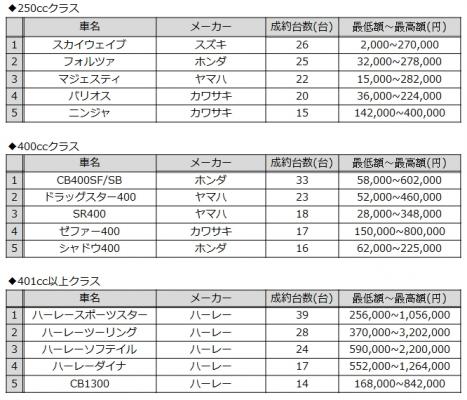 情報流通支援サービスの株式会社オークネット(本社:東京都港区/社長:藤崎清孝)は、2017年1月度のオークネットバイクオークションにおける成約台数を集計し、排気量別ランキングベスト5をまとめました。