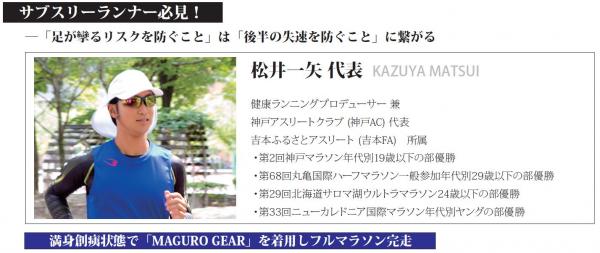 松井氏は、満身創痍状態の足で「MAGURO GEAR」を着用し、足を攣ることなくフルマラソンを完走。世界一過酷なトライアスロンと言われる、鉄人レース・アイアンマン(スイム3.8km、バイク180km、ランニング42.2km)に挑戦1週間後に迎えた第6回神戸マラソンで「MAGURO GEAR」を着用し出場。当日は、筋肉痙攣が止まらず、すでに脹脛が攣りそうな感覚を覚えるくらい筋肉が固まっていました。アイアンマン挑戦中は何度も足を攣り、まだ癖の残っている状態でしたが、ハムストリングスや脹脛に負担がかかる登り坂コースの神戸マラソンでは最後まで足を攣ることなく走り切ることができ数々のレース出場経験者である松井氏も「MAGURO GEAR」の実力に感動を述べています。”サブスリー”をなかなか達成できないランナーは後半失速する人が多く、足の攣るリスクを防ぐことができれば、後半の失速を防げる可能性は高まります。