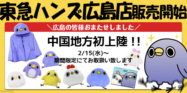 株式会社インクルーズ(東京都新宿区、代表取締役 山崎 健司)は、大人気LINEスタンプ「面倒だがトリあえず返信」の「めんトリ」のキャラクターグッズを期間限定にて、2月15日より、東急ハンズ広島店にて販売開始することをご報告致します。