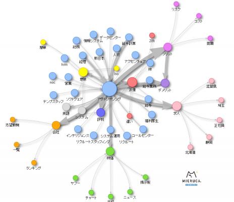 ▼ミエルカの「サジェストキーワードネットワーク」機能を使って、「アウトソーシング」を調べたユーザーの検索意図を可視化した例