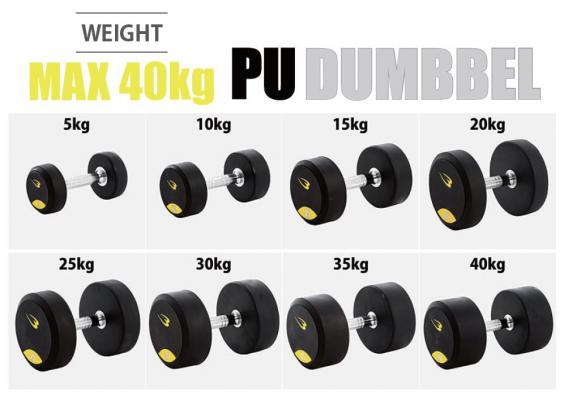 5kg 刻みの重量固定式「PU ダンベル」は5kg ~ 40kg の計8 種がラインナップ。シャフト部分はローリング仕様になっ