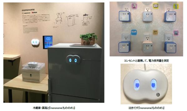 イベント会場では、(1)冷蔵庫に取り付けた『mononome(もののめ)』が、電気使用量や扉の開閉に応じて喜怒哀楽の感情を示す (2)薬箱に取り付けた『mononome(もののめ)』が、予め登録した服薬時間に薬が取り出されると笑顔になり、忘れていると泣きだし、やがて怒りだすデモンストレーションを行い、日常生活の中での『mononome(もののめ)』の活用事例を紹介します。
