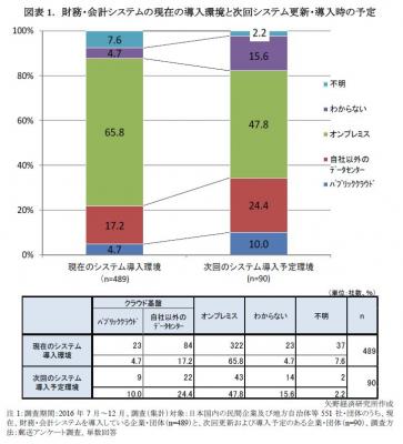 本調査では、日本国内の民間企業及び地方自治体等を対象として、ERPや「財務・会計」、「人事・給与」、「販売管理」、「生産管理・SCM」の基幹業務ソフトウェアの導入実態に関する郵送アンケート調査を実施したが、今回はとくに財務・会計システムにおけるクラウド基盤利用の有無、次回システムを更新する際にはどのシステム環境を選択するかについての分析を行った。