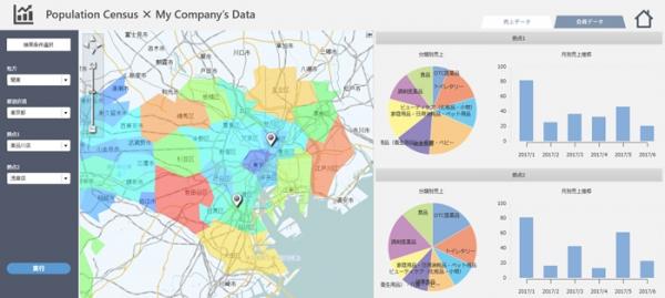 国勢調査「データを掛け合わせる」テンプレート。店舗周辺商圏の居住者プロファイリングと売れ筋商品との相関分析など、自社データと第三者データの統合分析の活用シミュレーションが可能。