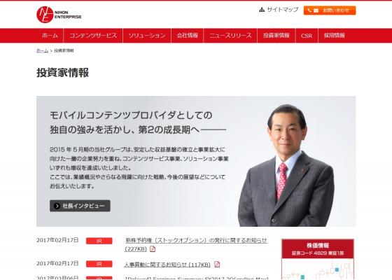 日本エンタープライズ株式会社(本社:東京都渋谷区、代表取締役社長:植田勝典)は、当社ホームページが、日興アイ・アール株式会社が実施する「2016年度 全上場企業ホームページ充実度ランキング」にて、『総合ランキング・優良サイト』に選定されましたので、平成29年2月24日、お知らせいたします。