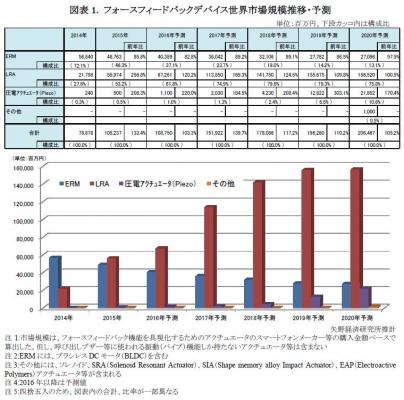 本調査におけるフォースフィードバックデバイスとは、ERM(Eccentric Rotation Mass:偏心モータ)やLRA(Linear Resonant Actuator:リニア共振アクチュエータ)、圧電アクチュエータ(Piezo素子)等のフォースフォードバック機能を具現化するための主要デバイスであるアクチュエータを指し、市場規模はスマートフォンメーカー等の購入金額ベースで算出した。但し、呼び出しブザー等に使われる振動(バイブ)機能しか持たないアクチュエータ等は含まない。