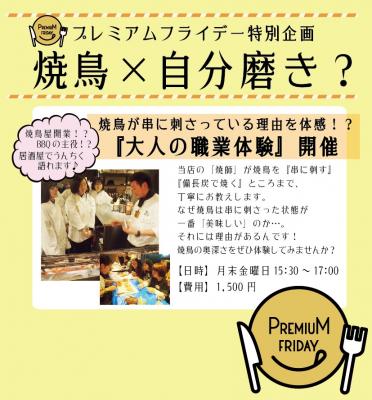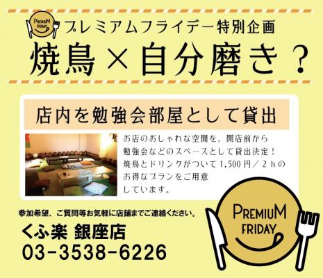 焼鳥チェーン居酒屋「くふ楽」、「福みみ」を展開するKUURAKU GROUP(千葉市、福原裕一代表)は、弊社の店舗「くふ楽 銀座店」にてプレミアムフライデーの特別企画として『炭火で焼鳥を焼く大人の職業体験』と『店内スペースを勉強会部屋に貸し出し』の二つの企画を行います。