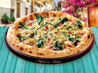 もちもちのナポリ生地の上にぺペロンチーノソースをぬり、瀬戸内海産釜揚げしらす、粗挽きソーセージ、菜の花をトッピング。白ごまと刻みのりで和テイストにいたしました。