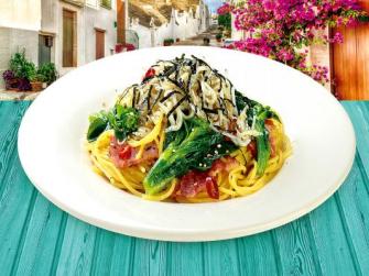 ペペロンチーノソースに瀬戸内海産の釜揚げしらすと菜の花が大変良くあいます。
