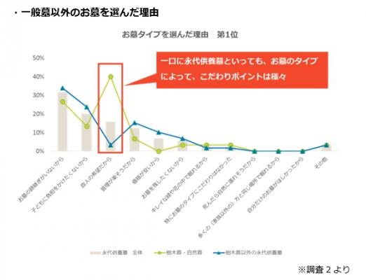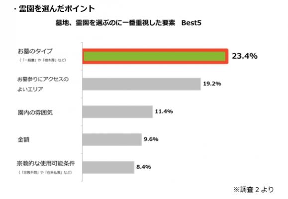 「お墓のタイプ(「一般墓」や「樹木葬」など)」が「お墓参りにアクセスのよいエリア」や「園内の雰囲気」を抑え1位にランクインしました。新しいタイプのお墓への知識・関心が高まり、こだわりをもってお墓探しをしている人が多くいることがうかがえます。