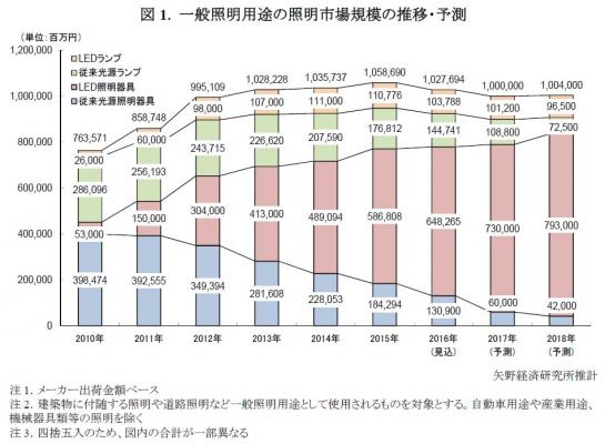 ◆2017年の一般照明用途の照明市場規模は前年比2.7%減の1兆円、