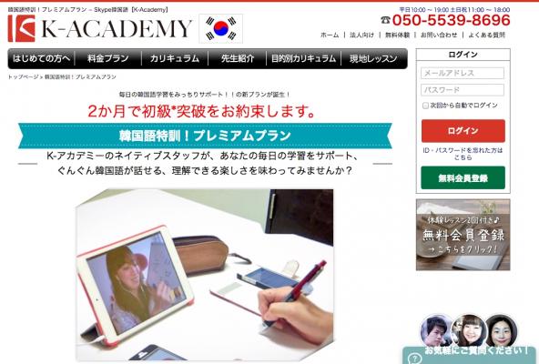 「K-ACADEMY」とは、「韓国語がグッと近くなる いちばん近い韓国語教室」をコンセプトに、スカイプを利用し自宅やカフェから気楽に、オンラインでマンツーマンの韓国語レッスンが予約・受講できるサービスです。