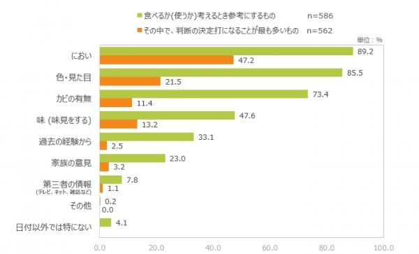 ■期限日以外の判断要素として多いのは「におい」「色・見た目」「カビの有無」 n=586