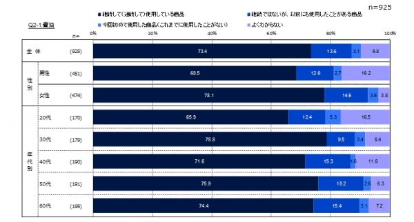 ■同じ商品の継続使用者は、すべての品目において7割前後を占める。最も高いのはシャンプー・コンディショナーの76.7%。