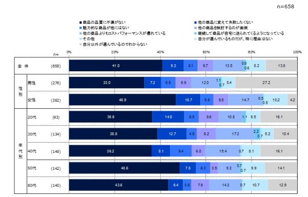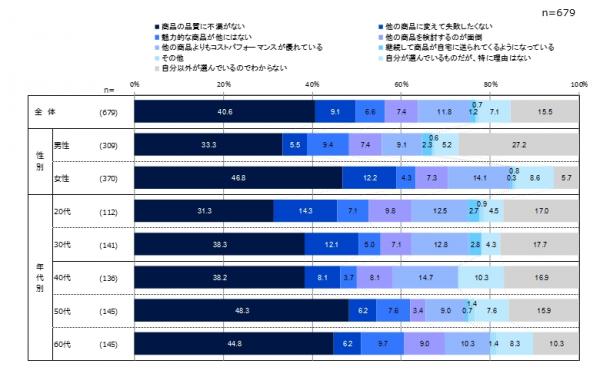 ■同じ商品を継続使用する理由は、いずれの品目も「商品の品質に不満がない」が最も高い