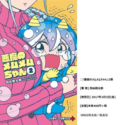 「少年ジャンプ+」で好評連載中の『悪魔のメムメムちゃん』(著・四谷啓太郎)のジャンプコミックス第2巻が3月3日(金)に発売となります。帯には人気ゲーム『Fate/Grand Order』や、『空の境界』を手がけるシナリオライターの奈須きのこ氏(TYPE-MOON)が推薦文を寄せてくださいました。読切版の時からメムメムちゃんに注目していた奈須氏だけに、帯コメントとしては異例の長さで熱くおすすめしています。なお、2巻にはコミックスだけの描き下ろし漫画15ページも収録。