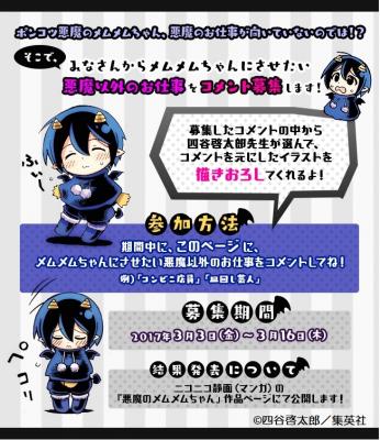 ポンコツ悪魔のメムメムちゃんは悪魔の仕事が向いていないのでは・・・?ということで、メムメムちゃんにさせたい悪魔以外のお仕事を「ニコニコ静 画(マンガ)」の『悪魔のメムメムちゃん』作品ページにて、コメント募集いたします。募集期間は2017年3月3日(金)から3月16日(木)。募集した コメントの中から四谷啓太郎氏が選び、コメントを元にしたイラストを描きおろします。この描きおろしイラストは、同ページにて公開いたします。悪魔の仕事が向いていないメムメムちゃんに、悪魔以外のお仕事をぜひご一考下さい。