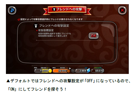 ※「オプション」から「フレンドへの攻撃」、「フレンドへの攻撃設定」を「ON」にしないと