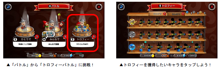 各キャラのトロフィー獲得を目指して、全国のプレイヤーとバトルを行なう「トロフィーバトル」を