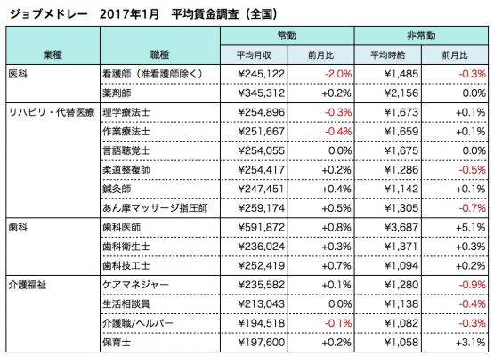 株式会社メドレー(本社:東京都港区、代表取締役社長:瀧口 浩平、代表取締役医師:豊田 剛一郎)が運営する医療介護求人サイト「ジョブメドレー」は、医療介護系15職種について、2017年1月の平均月給・時給をまとめました。
