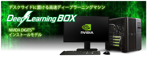 GDEPアドバンスでは、日本で初めてディープラーニングGPUトレーニング・システムの「NVIDIA(R) DIGITS(TM)ソフトウェア」がインストールされたオールインワンDeepLearning開発キットを発売しました。以来、深層学習研究において、高効率で高いパフォーマンスを発揮できるようNVIDIAディープラーニングSDKをはじめ、学習フレームのCaffe、TensorFlow、CNTK、chainer、Theano等のISVフレームワークはもとより、CUDA、DIGITS、CuDNN、cuda-convnet2などNVIDIA製ソフトウェアスタッグとの整合性と動作確認がとれたシステムを提供しています。また、主要パーツであるGPUは最大1~8基まで搭載可能でディープラーニングのトライアルから大量の学習データまで様々なお客様の要件に対応、届いたその日から安心して導入いただける深層学習(DeepLearning)研究のスピードアッププラットフォームを提供しています。
