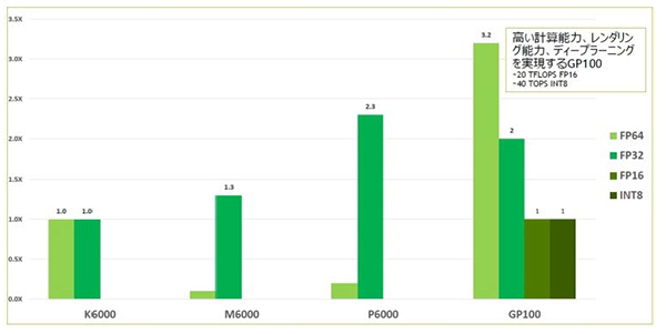 「QuadroGP100」は、3584基のF32用CUDAコアと1792基のFP64CUDAコアを集積し、総メモリバス帯域幅が720GB/sに達する16GB容量の積層メモリ「HBM2」(High Bandwidth Memory 2)を組み合わせた、NVIDIAフラッグシップGPUカードであり、演算性能は倍精度で5TFLOPS、単精度で10TFLOPS、半精度では実に20TFLOPSの性能を実現しています。これにより、GPUを利用したDeepLearningの学習フレームにおいて、大幅な学習時間の軽減が期待できます。また、2枚を2つの専用ブリッジによって接続することで、最大80GB/sで接続するNV-LINKにも対応し、GPU間メモリの共有などとともに学習能力をパワフルに加速させることができます。