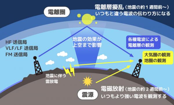 地震が迫ってくると、地圏(地下)、大気圏(地上)、電離圏(宇宙)に異常をきたす。地震が起こる前には、地殻のヒビ割れが起こり、このヒビが電磁波を発生させ、大気圏を振動させ、地球上空の電離圏まで作用する。これらがすべて地震の起こる約1ヶ月前から起こる。地圏では地震の前に発生する電磁波(ULF/ELF)を直接受信して地下での前兆現象をつかみ、大気圏、電離圏では地上から送信される電波(VLF/HF/VHF)の異常を観測して地上から宇宙での前兆現象をつかむ。各観測手法で得られた結果から地震の3要素(いつ、どこで、どのくらいの規模)を約1週間前に予測する。