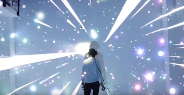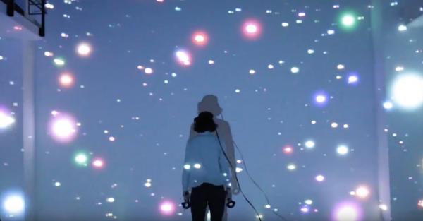 VRインスタレーションアート「RELATIVITY / 相対性」はVRとプロジェクションマッピングの技術を利用し、体験者が自ら光と音の空間を進みます。VR空間上での操作によって加速し、光の点は線となり場を形成していきます。