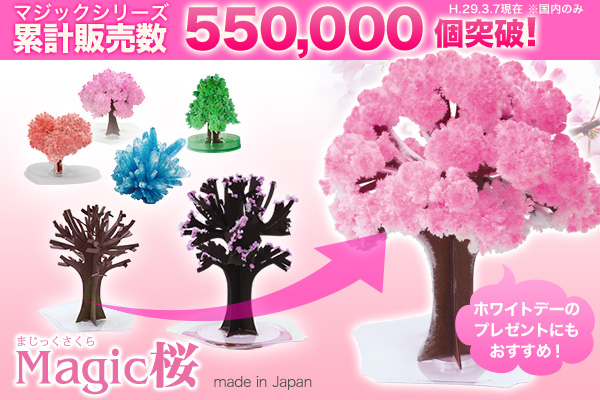 マジックシリーズの中でも特に人気の、魔法の水をかけると12時間で咲く不思議な桜「マジック桜」は今からの時期におすすめです。6時間で咲くミニサイズもあります。ホワイトデーのプレゼントや卒業、入学のお祝いにもピッタリです。