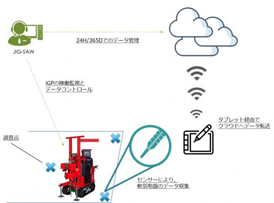 地盤ネットは、JIS規格に準拠した戸建住宅向け全自動地盤調査機「iGP(R)(R)(R)(アイ・ジー・ピー)」の開発により、地盤調査データのデジタル化を実現しました。安全な住宅を設計する上で、地盤の土質は重要な要素となり、地盤ネットは、土質サンプラーを使用した調査現場からの土質採取による高度解析を行っておりますが、土質分析においては、人的に判断されるものであり、数値的根拠が存在しないことが現状です。そこで、IoT及びデータコントロールなどの専門分野における最新テクノロジーとその実績をもつJIG-SAWとの共同開発により、まず、軟弱地盤(腐植土など)を検知するためのセンシングプロジェクトの取り組みを開始致します。