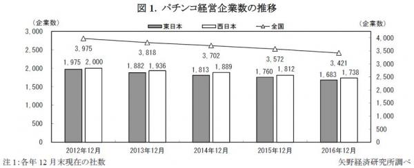 ◆2016年12月末のパチンコホール経営企業数は3,421企業、店舗数は10,678店舗