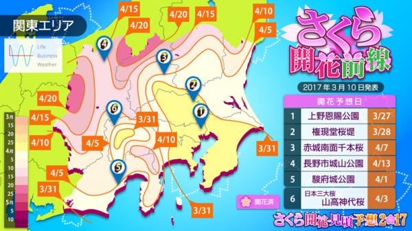 トップは福岡で3月23日、東京は3月27日の予想で、ともにほぼ平年並でしょう。