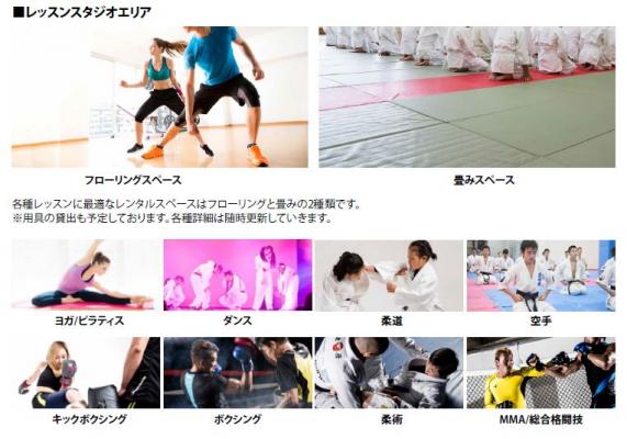 「レッスンスタジオエリア」は、各種レッスンに最適な仕様のフリースペース空間とし、「フローリングスペース」と「畳みスペース」の2 種類で確保します。「フローリングスペース」ではヨガ、ピラティス、フィットネス、ダンス、ボクシング、キックボクシングなどのレッスンに対応。「畳みスペース」では空手、柔道、柔術、MMA 総合格闘技などのレッスンに対応とインストラクター会員の理想を実現する自由なレッスンに対応します。