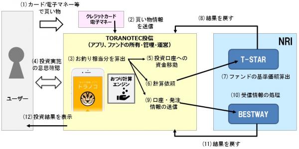 「トラノコ」で集められた資金は、TORANOTEC投信で運用されます。TORANOTEC投信では、「トラノコ」で投資するファンドの基準価額を、「T-STAR/TX」で算出します(図1の(7))。また、「トラノコ」は、取り込んだ資金やファンドの発注等の情報を「BESTWAY/JJ」と連携させ、「BESTWAY/JJ」は投資家の口座開設処理、ファンドの約定処理、対顧客帳票の電子交付等の処理を行った後(同(10))、その結果を「トラノコ」に戻します。 この仕組みによって「トラノコ」のユーザーは、日々小さな金額で手軽に投資を行い、資産を運用することが可能になります。
