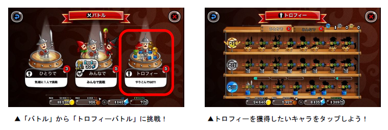 「トロフィーバトル」は、各キャラのトロフィー獲得を目指して、全国のプレイヤーとバトルを行ないます。