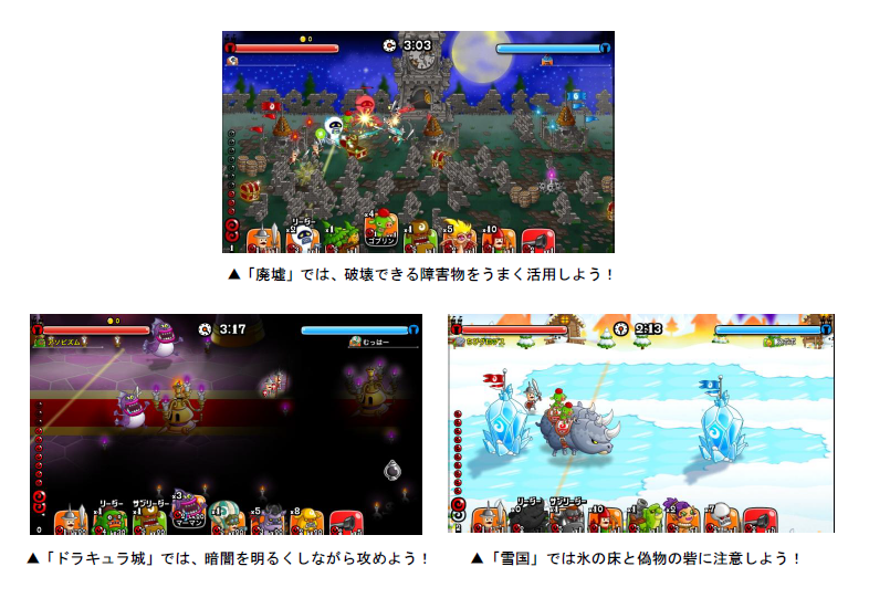 「草原」「廃墟」「ドラキュラ城」「雪国」のマップのうちいずれかに変化します。各マップの特徴を