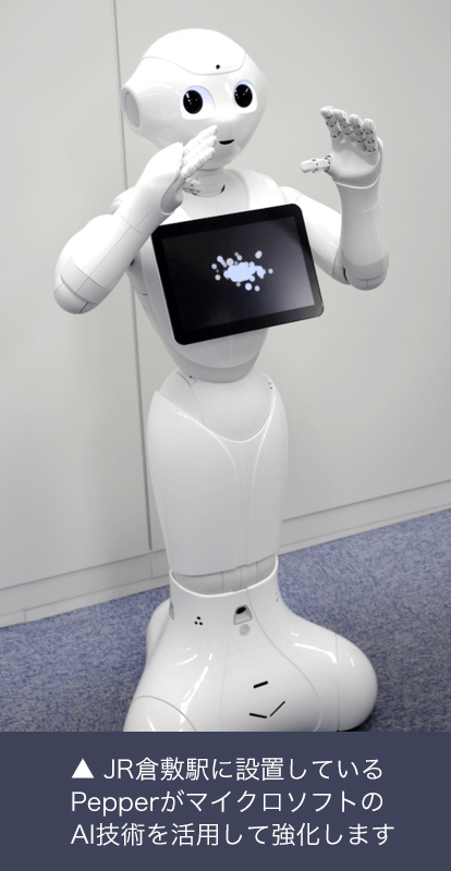 JR倉敷駅では、「Pepper」を使い、駅利用者向け案内サービスを提供していますが、お客様から駅員へ類似した問合せやPepperの操作に慣れていないお客様が多いという課題を解決し、駅サービスの強化を図るため、PepperにマイクロソフトのAI技術を連携させたロボアプリを開発しました。