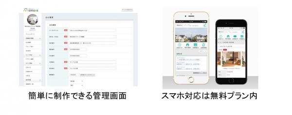 利用に際しての初期費用は無料で、必要事項を入力すれば、10分程度で物件を登録できる状態までサイトが完成します。基本的な機能に加えて、他社では有料あるいは未対応の場合が多いスマートフォンやLINE@への対応も無料プラン(ミニマムプラン)で利用可能で、今なら「有料プラン(ライトプラン)1ヶ月無料キャンペーン」も実施しています。