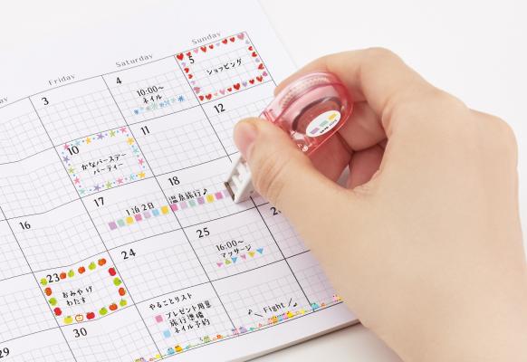 テープを引くだけでポップなデザインが転写される「デコラッシュ」シリーズから手帳作りに便利な柄「プチデコラッシュ」を2015年4月に発売。さらに同年9月には光沢インクを使用した光沢感のある柄「きらりプチデコラッシュ」を発売。可愛さと実用性を兼ね添えた手帳デコレーショングッズとして20~40代の手帳ユーザーを中心に好評を得ています。