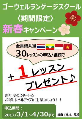 ゴーウェル株式会社(本社:東京都千代田区/代表取締役社長 松田秀和)は、需要が急激に増えている東南アジア語レッスンをより多くの皆様に受講していただけるよう、2017年3月~4月末までの間、30レッスンのお申込みで1レッスン無料となる期間限定キャンペーンを行っています。