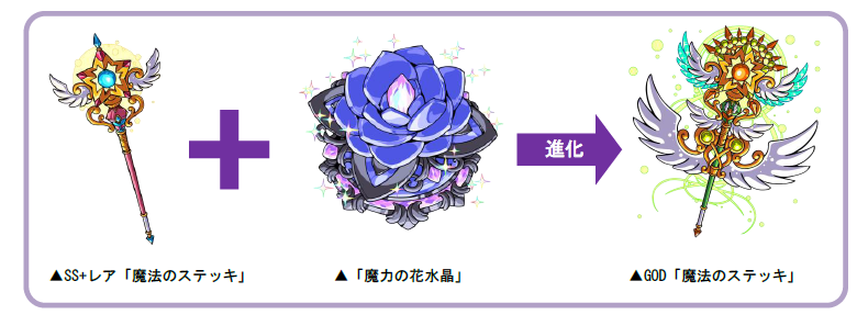 ※進化素材「魔力の花水晶」は、強化素材「魔法のステッキ」をSS+レア以上に進化させる際に必要となります。