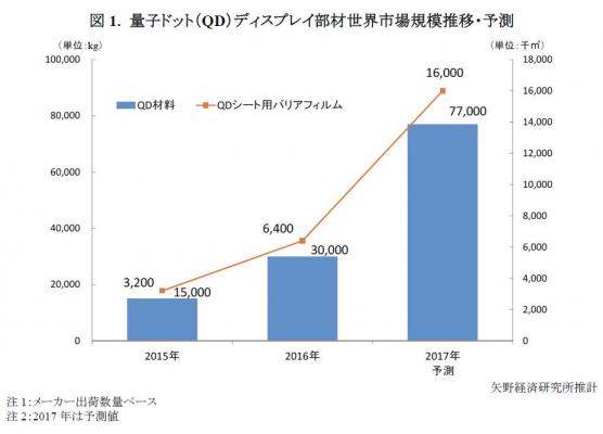 ◆2017年の世界のQD材料出荷数量は前年比256.7%の77t、QDシート用バリアフィルム出荷数量は前年比250.0%の1,600万平方メートルを予測