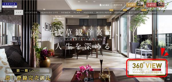 「クレヴィア浅草」のWEBサイトでは360°パノラマでしか表現できない臨場感や高級感をWEB上で体感でき、お客様が自由に閲覧したい部屋に移動し、気になった箇所をクリックすることで動画や画像、説明文などパノラマ画像上で確認いただけるなど、「実際にモデルルームに足を運び、内覧している感覚」を得られます。