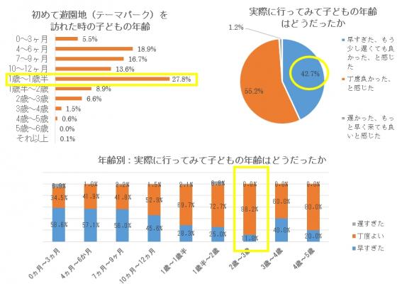 年齢別に見てみると、2歳~3歳に初めて連れて行ったという方が最も多く“丁度良い”(子どもの年齢は)と答え、“早すぎた”と答える割合は最も少なくなる結果になりました。これらのグラフから子どもの遊園地デビューの年齢は2歳~3歳ごろからが安心であるといえそうです。
