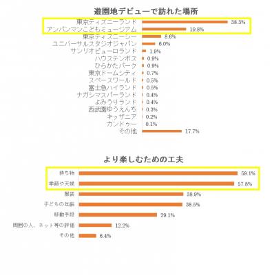 初めての遊園地がどこだったのかを調査してみると、「東京ディズニーランド」が38.3%、「アンパンマンこどもミュージアム」が19.8%と群を抜く結果となりました。